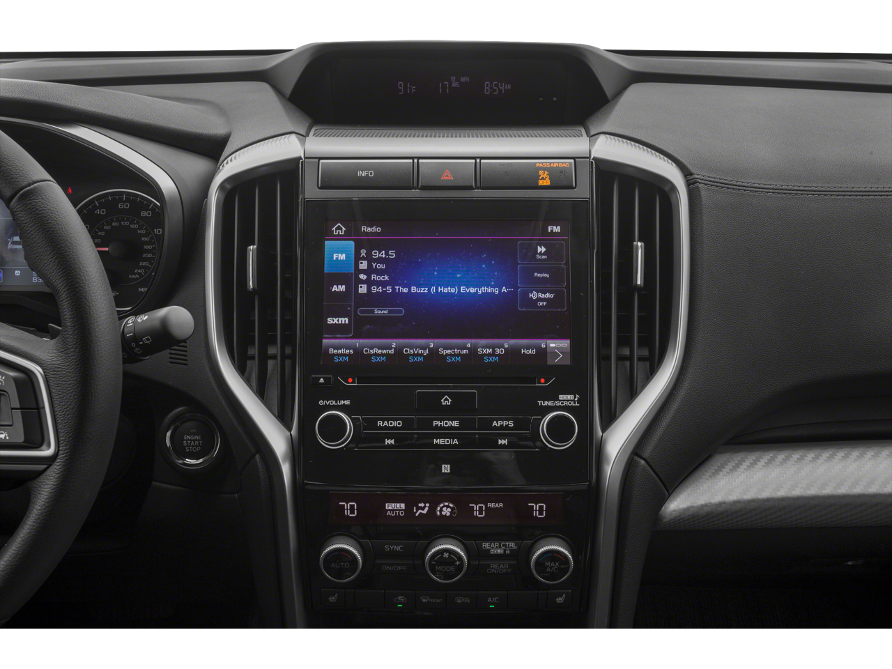 - Radio: Subaru STARLINK 8.0" Multimedia Plus System -inc: AM/FM stereo HD Radio w/single disc CD player, MP3/WMA/CRR/RW file capability, multi touch gesture high resolution LCD display screen, voice activated controls, Bluetooth® audio streaming connectivity, Bluetooth® hands-free phone connectivity, Bluetooth® hands-free SMS text messaging connectivity (applicable w/compatible cell phone), Near Field Communication (NFC), iPod control capability, SiriusXM All Access radio (subscription required), SiriusXM Travel Link (subscription required), smartphone integration for Aha, Android Auto, CarPlay and Pandora, STARLINK cloud applications, steering wheel controls for audio and Bluetooth®, 6 speakers, 3.5mm auxiliary input jack and front and rear dual USB ports