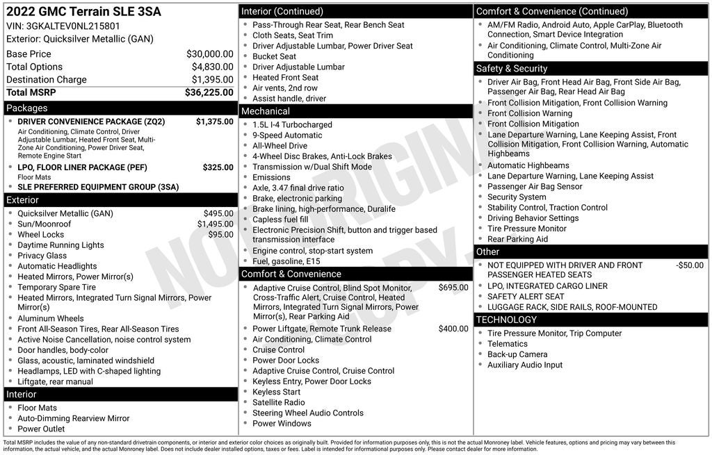 This Terrain SLE is powered by a 1.5L DOHC engine paired with a 9-Speed Automatic transmission and All-Wheel Drive, delivering a seamless and efficient driving experience. With an EPA-estimated 25 MPG in the city and 28 MPG on the highway, this SUV offers impressive fuel economy to complement its versatile capabilities.