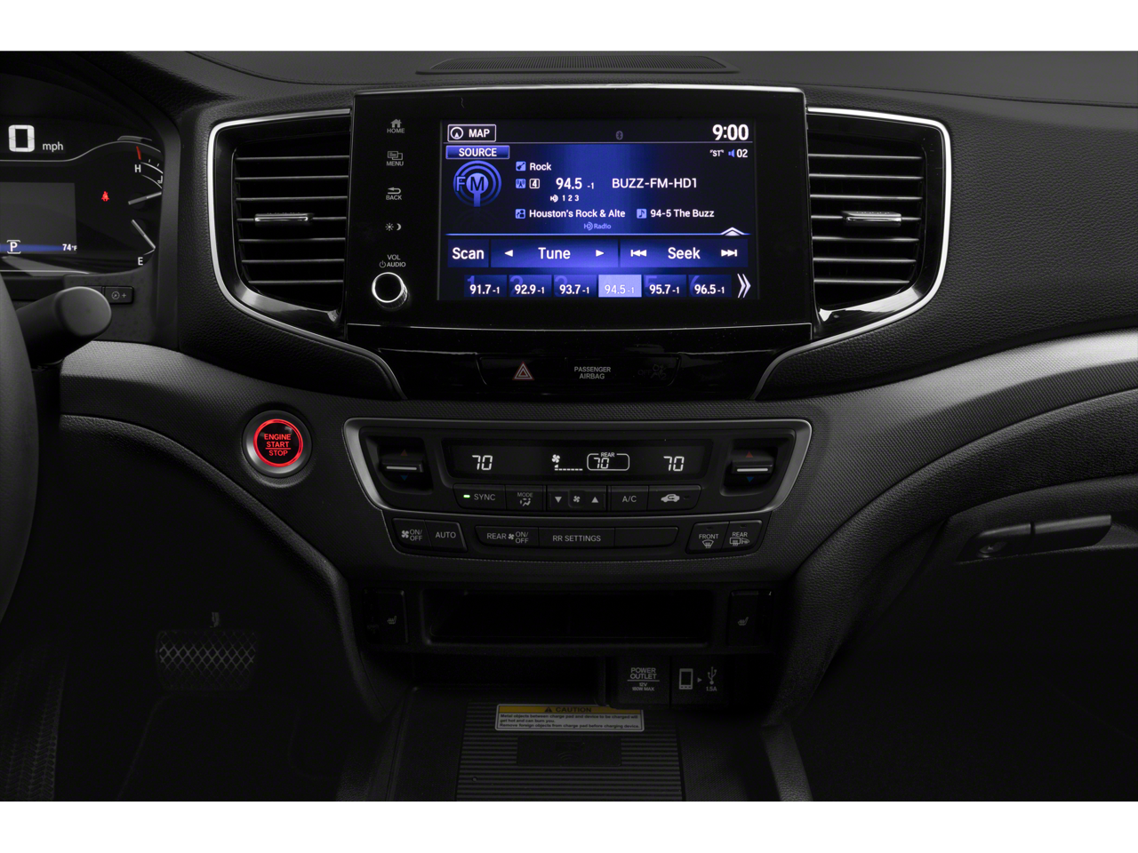 - Radio: 540-Watt Premium Audio System w/8 Speakers -inc: subwoofer, Bluetooth streaming audio, MP3/auxiliary input jack, Radio Data System (RDS), Speed-Sensitive Volume Compensation (SVC), 8" display audio w/high-resolution electrostatic touch screen and customizable feature settings, Apple CarPlay integration, Android Auto integration, HondaLink, SMS text message function, 1.5-amp USB smartphone/audio interface in front console (1 port), 2.5-amp USB charging port in center console (1 port), HD Radio, truck-bed audio system and wireless phone charger